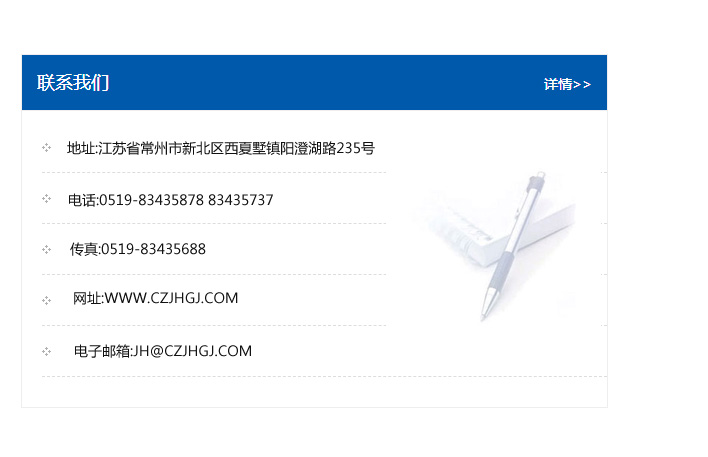 地址:常州市新北區友邦商務大廈1幢16、17層  電話:0519-85101652  傳真:0519-85112595  郵編:213022  網址:www.cz-jiayue_cn.yuhaolp.com  郵箱:xiajifengaa@163.com